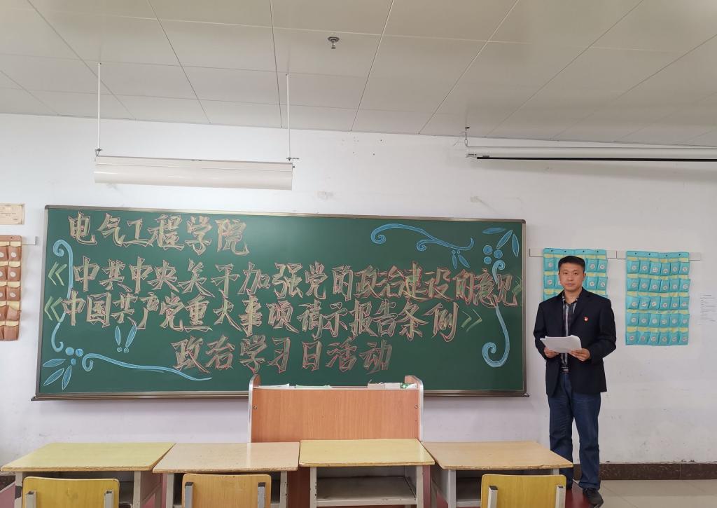 5月17日,电气工程学院党总支在教学楼620开展关于《中共中央关于加强党的政治建设的意见》和《中国共产党重大事项请示报告条例》政治学习日活动,全体党员参加本次活动,活动由电气工程学院党总支书记刘振波主讲。