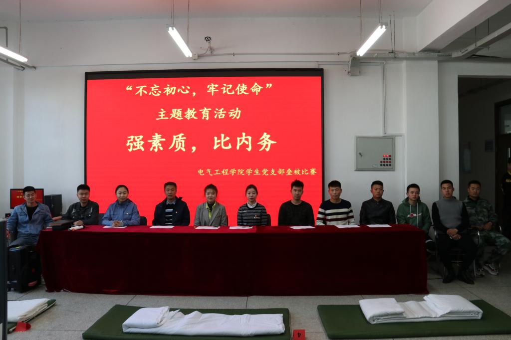 电气工程学院学生党支部按照“不忘初心,牢记使命”主题教育要求,边学边查,边查边改,在自查整改中发现电气分院公寓内务整体水平有待提高,为解决这一问题,电气学生党支部首先以学生党员和学生干部为切入点,在他们中开展“不忘初心,牢记使命-强素质,比内务”叠被比赛活动,让党员和学生干部在公寓管理中起到先锋模范带头作用。2019年10月15日,在三号实训楼二楼比赛如期而至,参赛人员有预备党员、舍务部学生干部,共计50人。