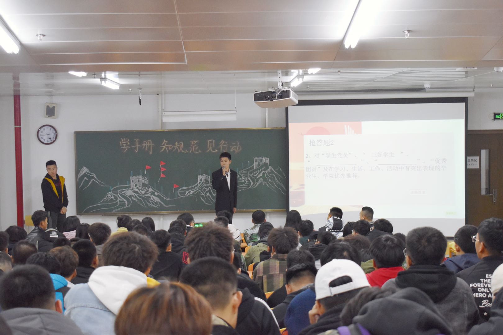 10月29日,学院利用晚自习的时间组织《学生手册》知识竞赛,学院全体学生参赛,此次比赛是为检验学生对《学生手册》的了解程度,同时,也为巩固加强学生对学生管理规定、学生行为准则、奖惩方式等规章制度的认知。